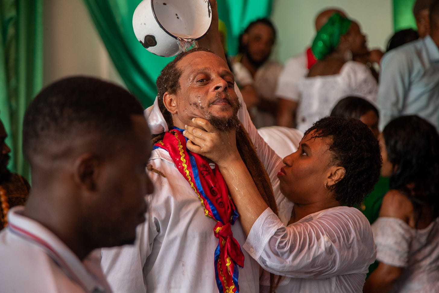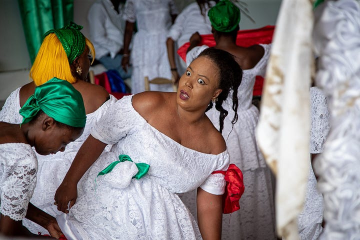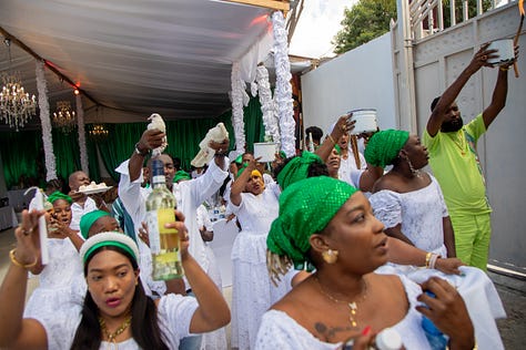 A lavish ceremony was held for Damballah in the Delmas 75 neighborhood of Lakou Salvatoris last week, and our photographer was there. After the prayers and a ritual to allow the lwa (spirits) to enter, Damballah, the snake lwa, appeared in the form of two of his “facets,” explains our contributor Françoise Ponticq, who was also present.