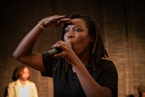 In addition to the characters on stage, a singing voice echoed the vendors’ demands throughout the play, accompanied by musicians. The characters managed to free themselves from their symbolic ropes when everyone finally began to talk to and listen to one another.